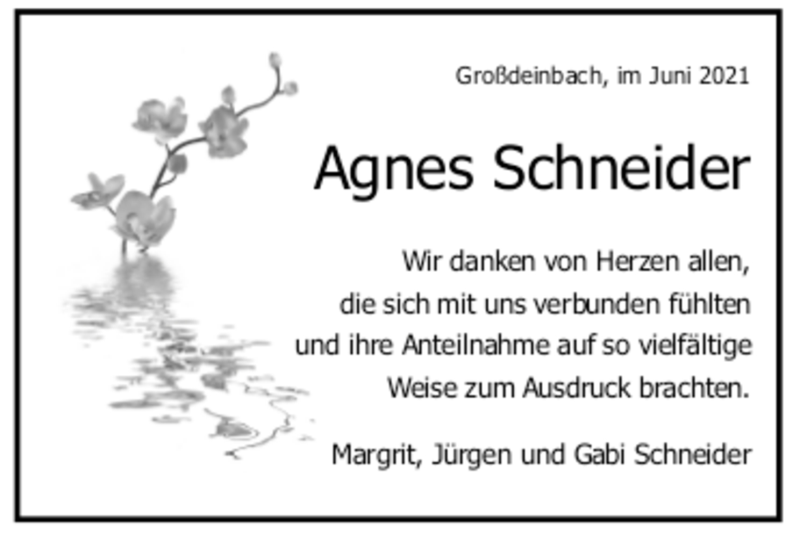 Hier finden Sie alle Traueranzeigen aus der Zeitung, die bisher für Agnes Schneider erschienen sind. Weitere Traueranzeigen, die in der Zeitung erscheinen, werden hier ebenfalls aufgelistet