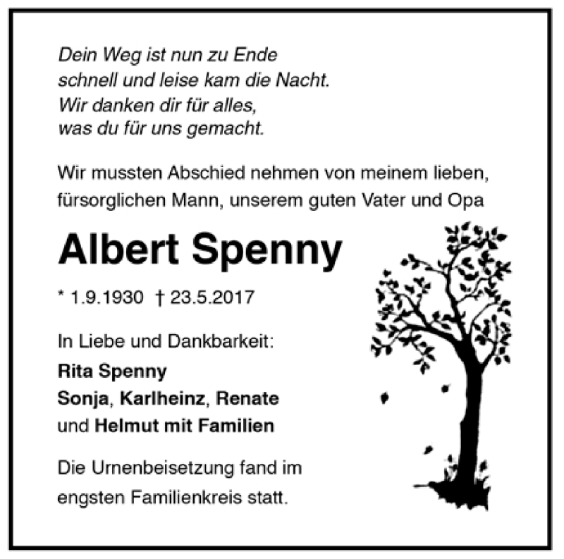 Hier finden Sie alle Traueranzeigen aus der Zeitung, die bisher für Albert Spenny erschienen sind. Weitere Traueranzeigen, die in der Zeitung erscheinen, werden hier ebenfalls aufgelistet