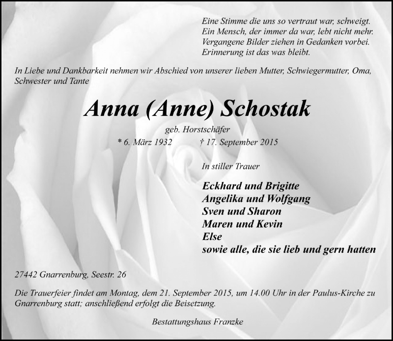 Hier finden Sie alle Traueranzeigen aus der Zeitung, die bisher für Anna (Anne) Schostak erschienen sind. Weitere Traueranzeigen, die in der Zeitung erscheinen, werden hier ebenfalls aufgelistet