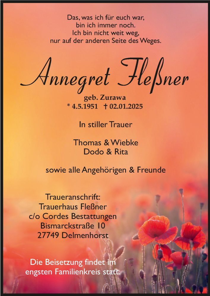 Hier finden Sie alle Traueranzeigen aus der Zeitung, die bisher für Annegret Fleßner erschienen sind. Weitere Traueranzeigen, die in der Zeitung erscheinen, werden hier ebenfalls aufgelistet