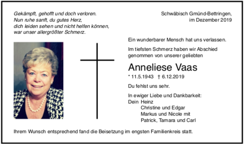 Hier finden Sie alle Traueranzeigen aus der Zeitung, die bisher für Anneliese Vaas erschienen sind. Weitere Traueranzeigen, die in der Zeitung erscheinen, werden hier ebenfalls aufgelistet