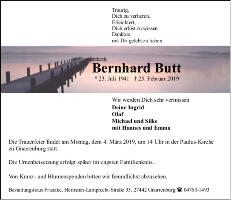 Hier finden Sie alle Traueranzeigen aus der Zeitung, die bisher für Bernhard Butt erschienen sind. Weitere Traueranzeigen, die in der Zeitung erscheinen, werden hier ebenfalls aufgelistet