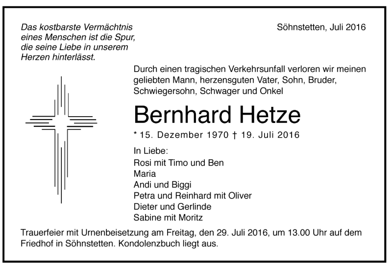 Hier finden Sie alle Traueranzeigen aus der Zeitung, die bisher für Bernhard Hetze erschienen sind. Weitere Traueranzeigen, die in der Zeitung erscheinen, werden hier ebenfalls aufgelistet