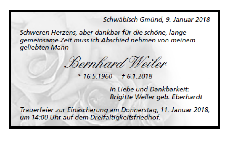 Hier finden Sie alle Traueranzeigen aus der Zeitung, die bisher für Bernhard Weiler erschienen sind. Weitere Traueranzeigen, die in der Zeitung erscheinen, werden hier ebenfalls aufgelistet