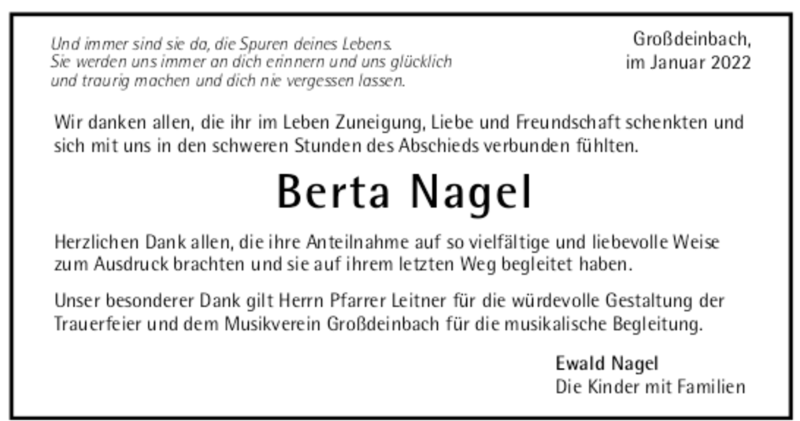 Hier finden Sie alle Traueranzeigen aus der Zeitung, die bisher für Berta Nagel erschienen sind. Weitere Traueranzeigen, die in der Zeitung erscheinen, werden hier ebenfalls aufgelistet