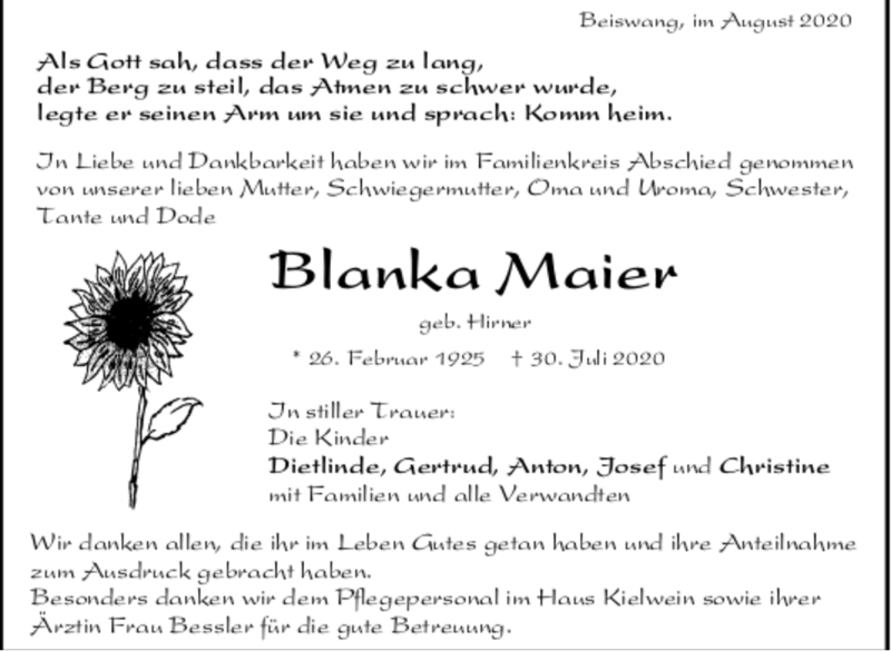 Hier finden Sie alle Traueranzeigen aus der Zeitung, die bisher für Blanka Maier erschienen sind. Weitere Traueranzeigen, die in der Zeitung erscheinen, werden hier ebenfalls aufgelistet