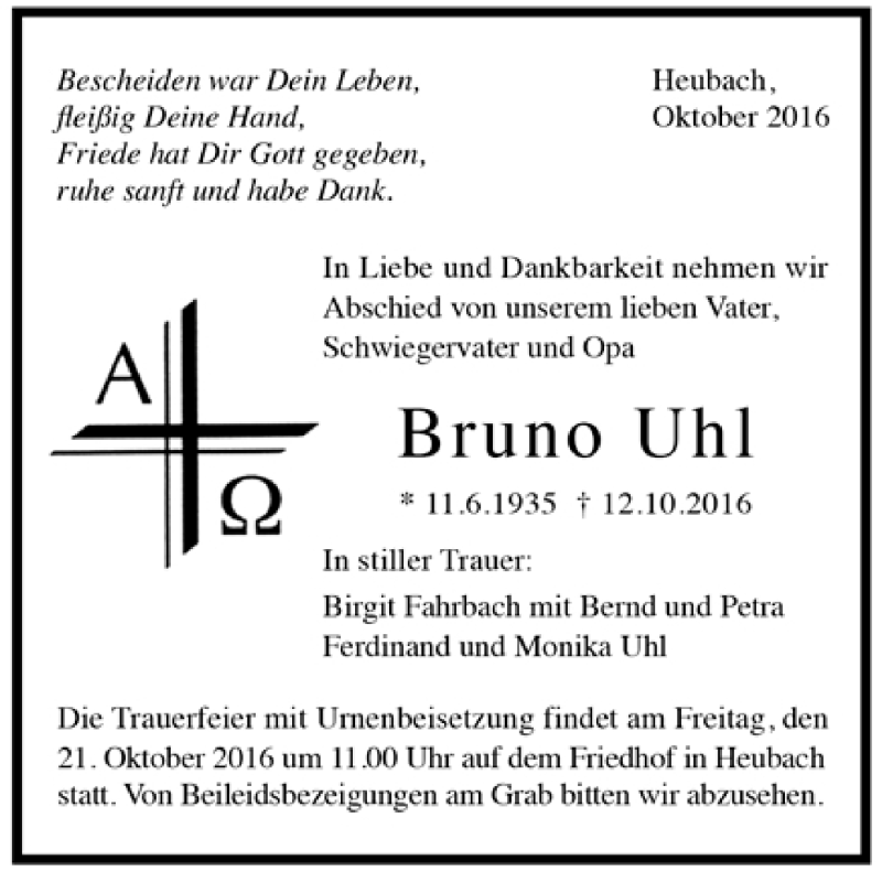 Hier finden Sie alle Traueranzeigen aus der Zeitung, die bisher für Bruno Uhl erschienen sind. Weitere Traueranzeigen, die in der Zeitung erscheinen, werden hier ebenfalls aufgelistet
