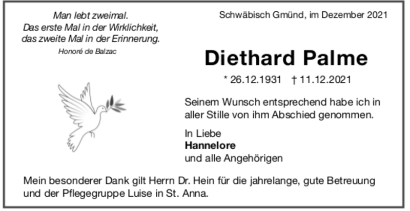 Hier finden Sie alle Traueranzeigen aus der Zeitung, die bisher für Diethard Palme erschienen sind. Weitere Traueranzeigen, die in der Zeitung erscheinen, werden hier ebenfalls aufgelistet
