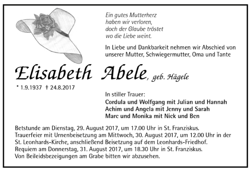 Hier finden Sie alle Traueranzeigen aus der Zeitung, die bisher für Elisabeth Abele erschienen sind. Weitere Traueranzeigen, die in der Zeitung erscheinen, werden hier ebenfalls aufgelistet