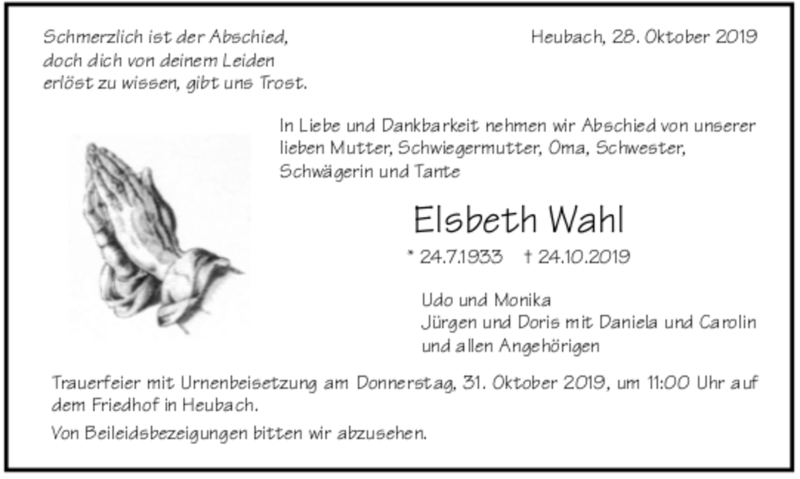 Hier finden Sie alle Traueranzeigen aus der Zeitung, die bisher für Elsbeth Wahl erschienen sind. Weitere Traueranzeigen, die in der Zeitung erscheinen, werden hier ebenfalls aufgelistet