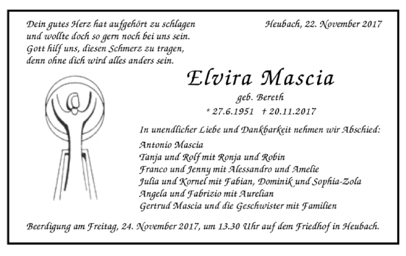 Hier finden Sie alle Traueranzeigen aus der Zeitung, die bisher für Elvira Mascia erschienen sind. Weitere Traueranzeigen, die in der Zeitung erscheinen, werden hier ebenfalls aufgelistet