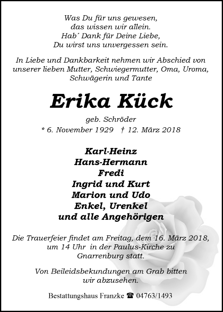 Hier finden Sie alle Traueranzeigen aus der Zeitung, die bisher für Erika Kück erschienen sind. Weitere Traueranzeigen, die in der Zeitung erscheinen, werden hier ebenfalls aufgelistet
