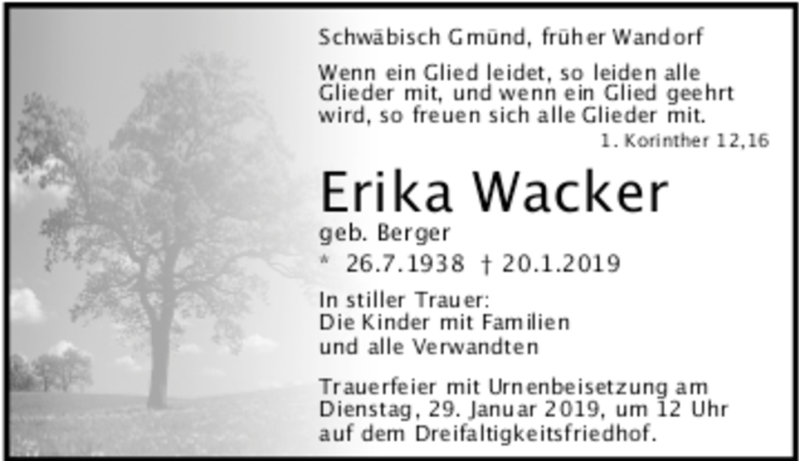 Hier finden Sie alle Traueranzeigen aus der Zeitung, die bisher für Erika Wacker erschienen sind. Weitere Traueranzeigen, die in der Zeitung erscheinen, werden hier ebenfalls aufgelistet