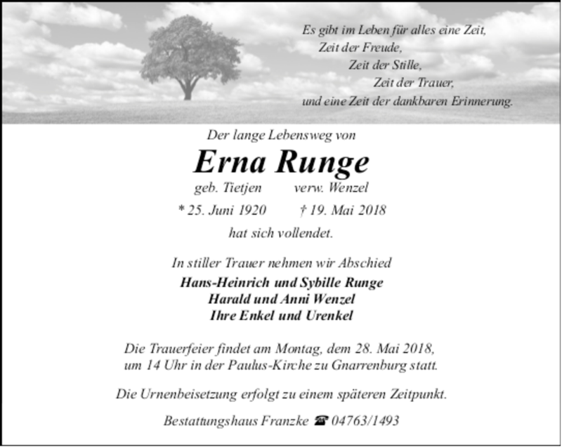 Hier finden Sie alle Traueranzeigen aus der Zeitung, die bisher für Erna Runge erschienen sind. Weitere Traueranzeigen, die in der Zeitung erscheinen, werden hier ebenfalls aufgelistet