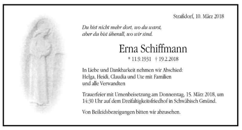 Hier finden Sie alle Traueranzeigen aus der Zeitung, die bisher für Erna Schiffmann erschienen sind. Weitere Traueranzeigen, die in der Zeitung erscheinen, werden hier ebenfalls aufgelistet