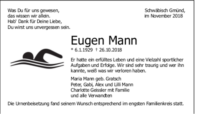 Hier finden Sie alle Traueranzeigen aus der Zeitung, die bisher für Eugen Mann erschienen sind. Weitere Traueranzeigen, die in der Zeitung erscheinen, werden hier ebenfalls aufgelistet
