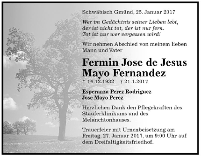 Hier finden Sie alle Traueranzeigen aus der Zeitung, die bisher für Fermin Jose de Jesus Mayo Fernandez erschienen sind. Weitere Traueranzeigen, die in der Zeitung erscheinen, werden hier ebenfalls aufgelistet