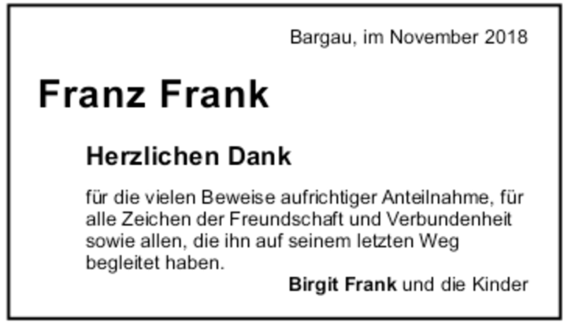 Hier finden Sie alle Traueranzeigen aus der Zeitung, die bisher für Franz Frank erschienen sind. Weitere Traueranzeigen, die in der Zeitung erscheinen, werden hier ebenfalls aufgelistet