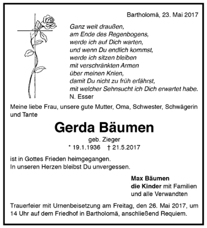 Hier finden Sie alle Traueranzeigen aus der Zeitung, die bisher für Gerda Bäumen erschienen sind. Weitere Traueranzeigen, die in der Zeitung erscheinen, werden hier ebenfalls aufgelistet