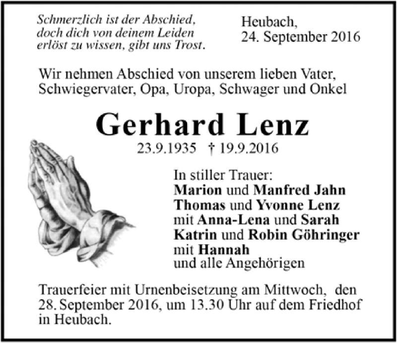 Hier finden Sie alle Traueranzeigen aus der Zeitung, die bisher für Gerhard Lenz erschienen sind. Weitere Traueranzeigen, die in der Zeitung erscheinen, werden hier ebenfalls aufgelistet