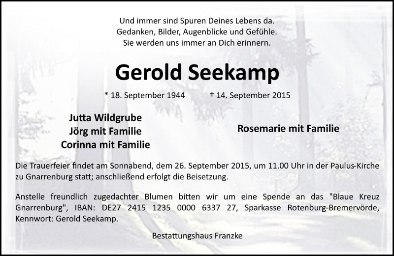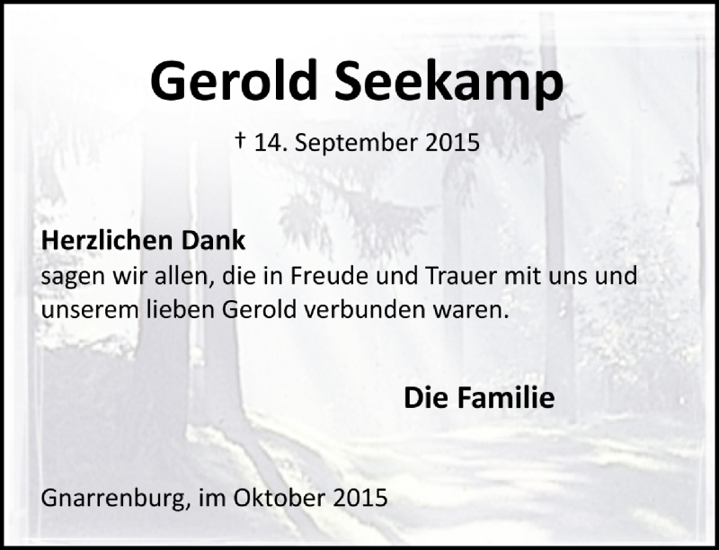 Hier finden Sie alle Traueranzeigen aus der Zeitung, die bisher für Gerold Seekamp erschienen sind. Weitere Traueranzeigen, die in der Zeitung erscheinen, werden hier ebenfalls aufgelistet