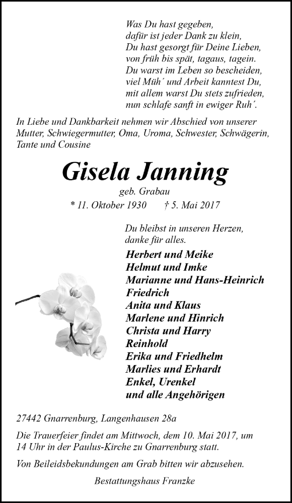 Hier finden Sie alle Traueranzeigen aus der Zeitung, die bisher für Gisela Janning erschienen sind. Weitere Traueranzeigen, die in der Zeitung erscheinen, werden hier ebenfalls aufgelistet