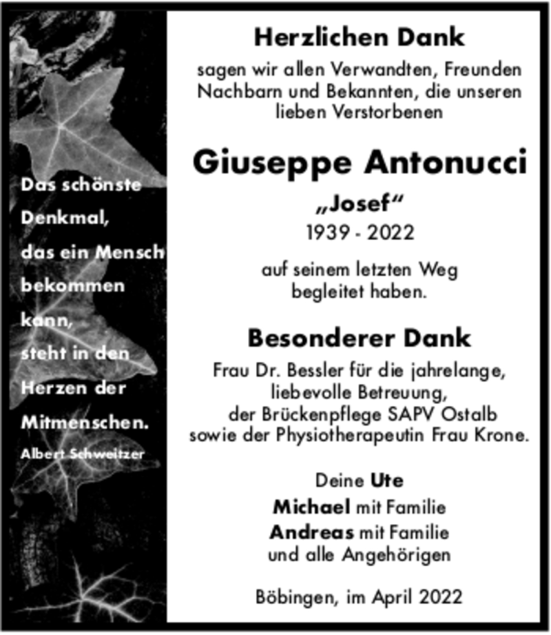 Hier finden Sie alle Traueranzeigen aus der Zeitung, die bisher für Giuseppe Antonucci erschienen sind. Weitere Traueranzeigen, die in der Zeitung erscheinen, werden hier ebenfalls aufgelistet
