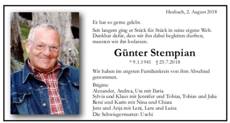 Hier finden Sie alle Traueranzeigen aus der Zeitung, die bisher für Günter Stempian erschienen sind. Weitere Traueranzeigen, die in der Zeitung erscheinen, werden hier ebenfalls aufgelistet