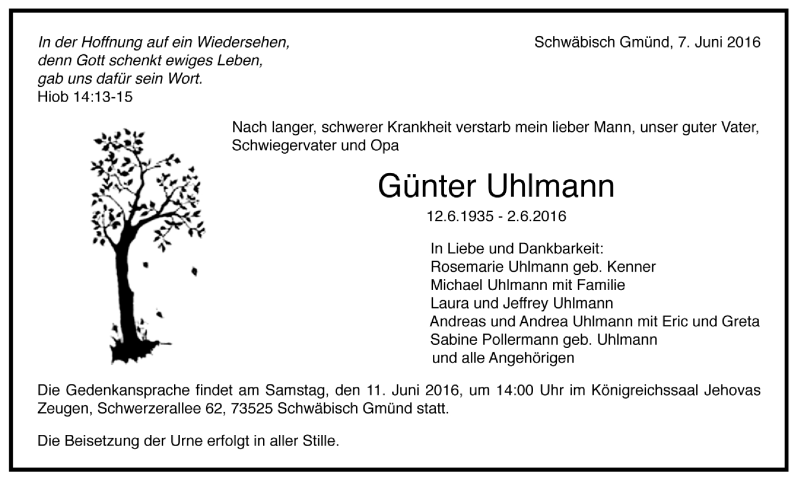 Hier finden Sie alle Traueranzeigen aus der Zeitung, die bisher für Günter Uhlmann erschienen sind. Weitere Traueranzeigen, die in der Zeitung erscheinen, werden hier ebenfalls aufgelistet