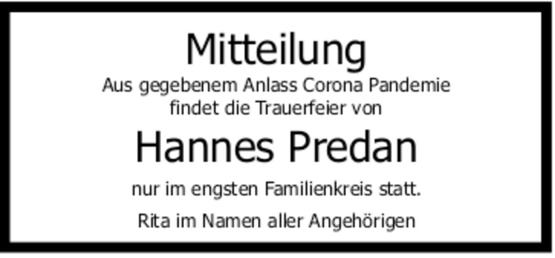 Hier finden Sie alle Traueranzeigen aus der Zeitung, die bisher für Hannes Predan erschienen sind. Weitere Traueranzeigen, die in der Zeitung erscheinen, werden hier ebenfalls aufgelistet