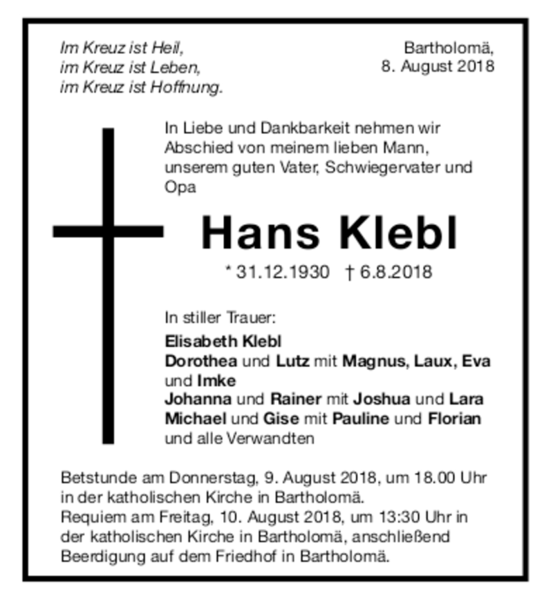 Hier finden Sie alle Traueranzeigen aus der Zeitung, die bisher für Hans Klebl erschienen sind. Weitere Traueranzeigen, die in der Zeitung erscheinen, werden hier ebenfalls aufgelistet