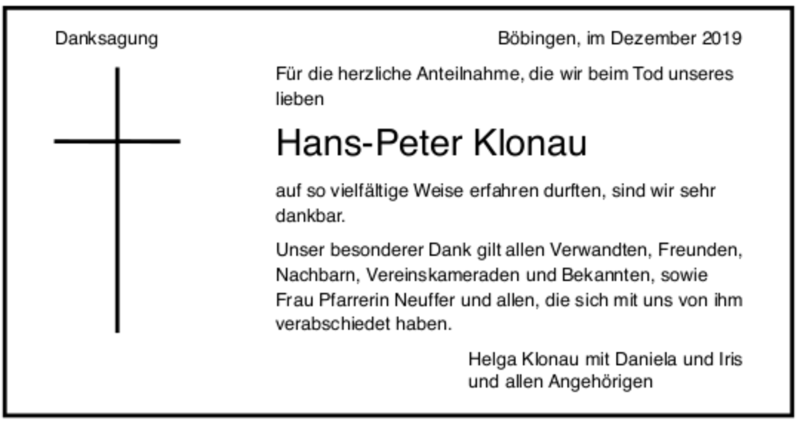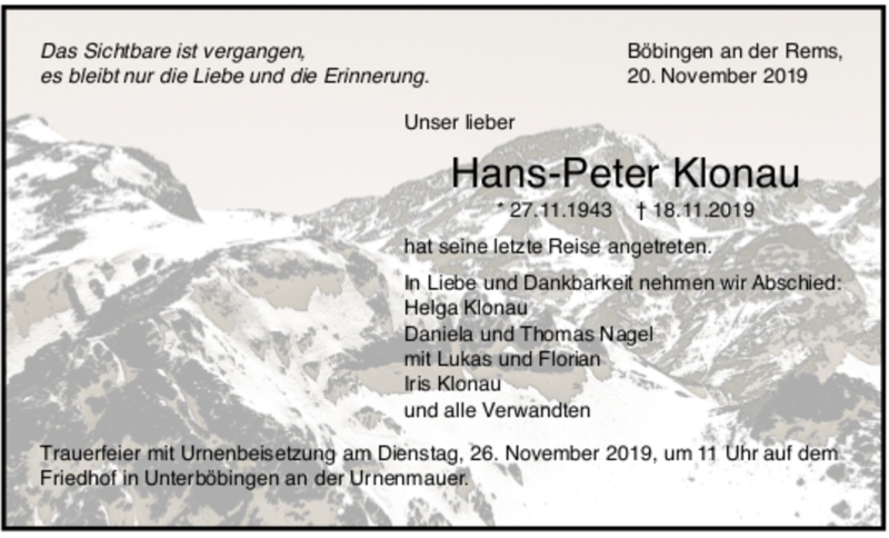 Hier finden Sie alle Traueranzeigen aus der Zeitung, die bisher für Hans-Peter Klonau erschienen sind. Weitere Traueranzeigen, die in der Zeitung erscheinen, werden hier ebenfalls aufgelistet