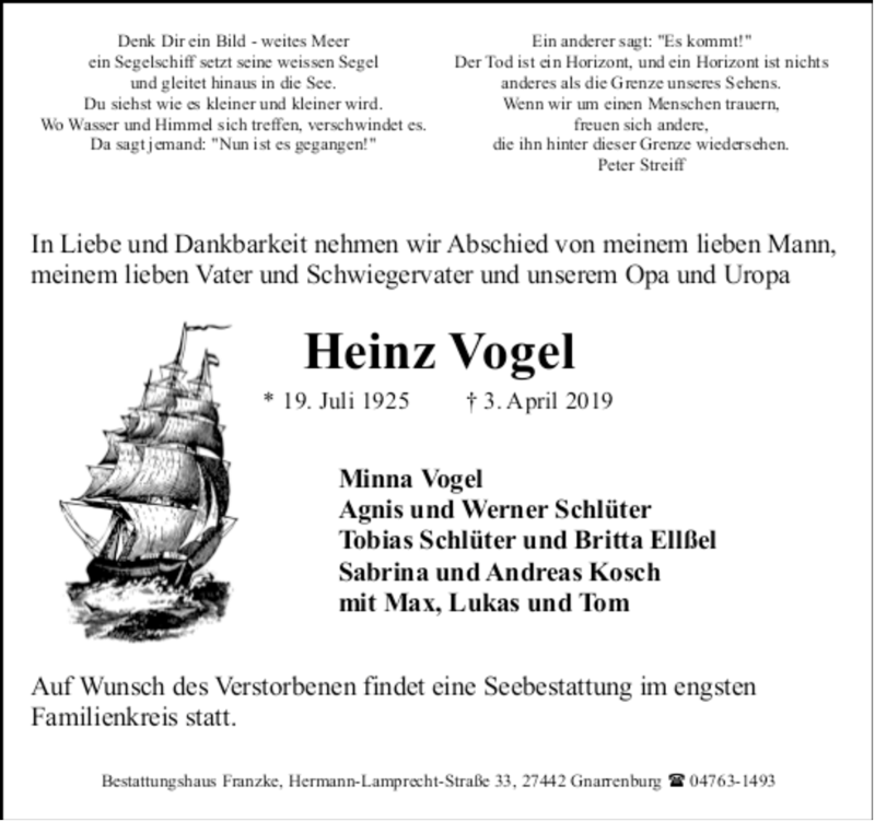 Hier finden Sie alle Traueranzeigen aus der Zeitung, die bisher für Heinz Vogel erschienen sind. Weitere Traueranzeigen, die in der Zeitung erscheinen, werden hier ebenfalls aufgelistet