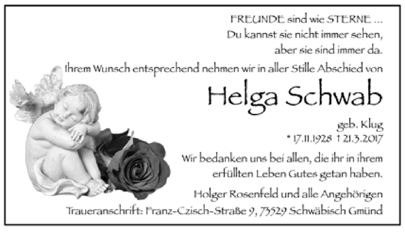 Hier finden Sie alle Traueranzeigen aus der Zeitung, die bisher für Helga Schwab erschienen sind. Weitere Traueranzeigen, die in der Zeitung erscheinen, werden hier ebenfalls aufgelistet