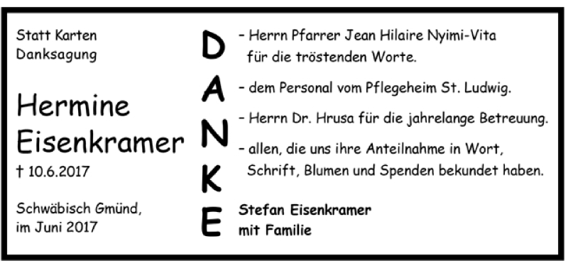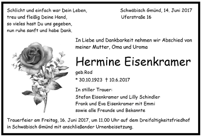 Hier finden Sie alle Traueranzeigen aus der Zeitung, die bisher für Hermine Eisenkramer erschienen sind. Weitere Traueranzeigen, die in der Zeitung erscheinen, werden hier ebenfalls aufgelistet