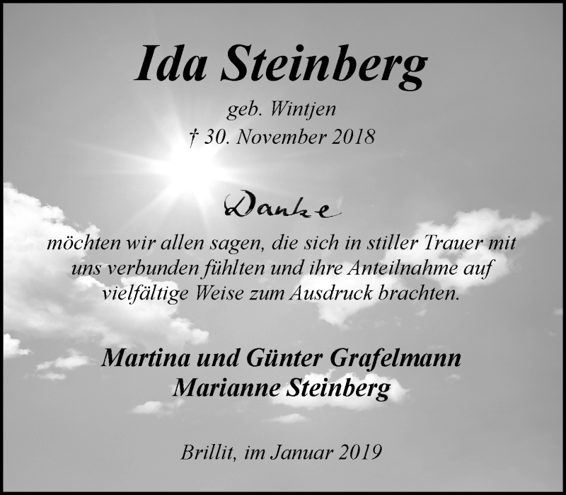 Hier finden Sie alle Traueranzeigen aus der Zeitung, die bisher für Ida Steinberg erschienen sind. Weitere Traueranzeigen, die in der Zeitung erscheinen, werden hier ebenfalls aufgelistet