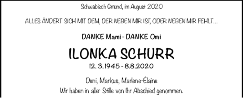 Hier finden Sie alle Traueranzeigen aus der Zeitung, die bisher für Ilonka Schurr erschienen sind. Weitere Traueranzeigen, die in der Zeitung erscheinen, werden hier ebenfalls aufgelistet