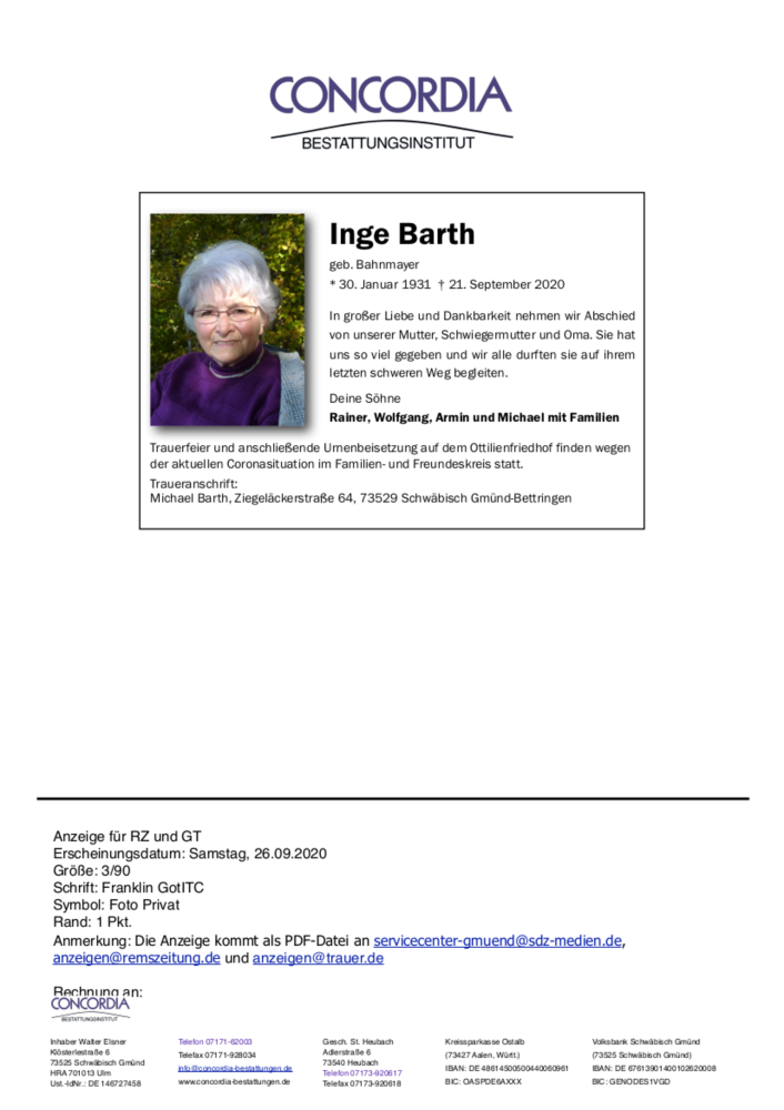 Hier finden Sie alle Traueranzeigen aus der Zeitung, die bisher für Inge Barth erschienen sind. Weitere Traueranzeigen, die in der Zeitung erscheinen, werden hier ebenfalls aufgelistet