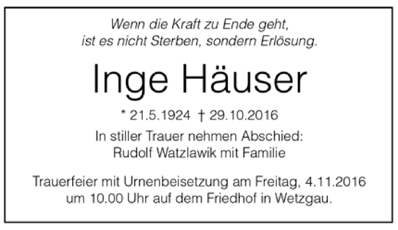 Hier finden Sie alle Traueranzeigen aus der Zeitung, die bisher für Inge Häuser erschienen sind. Weitere Traueranzeigen, die in der Zeitung erscheinen, werden hier ebenfalls aufgelistet