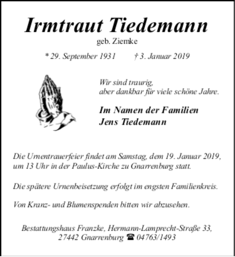 Hier finden Sie alle Traueranzeigen aus der Zeitung, die bisher für Irmtraut Tiedemann erschienen sind. Weitere Traueranzeigen, die in der Zeitung erscheinen, werden hier ebenfalls aufgelistet