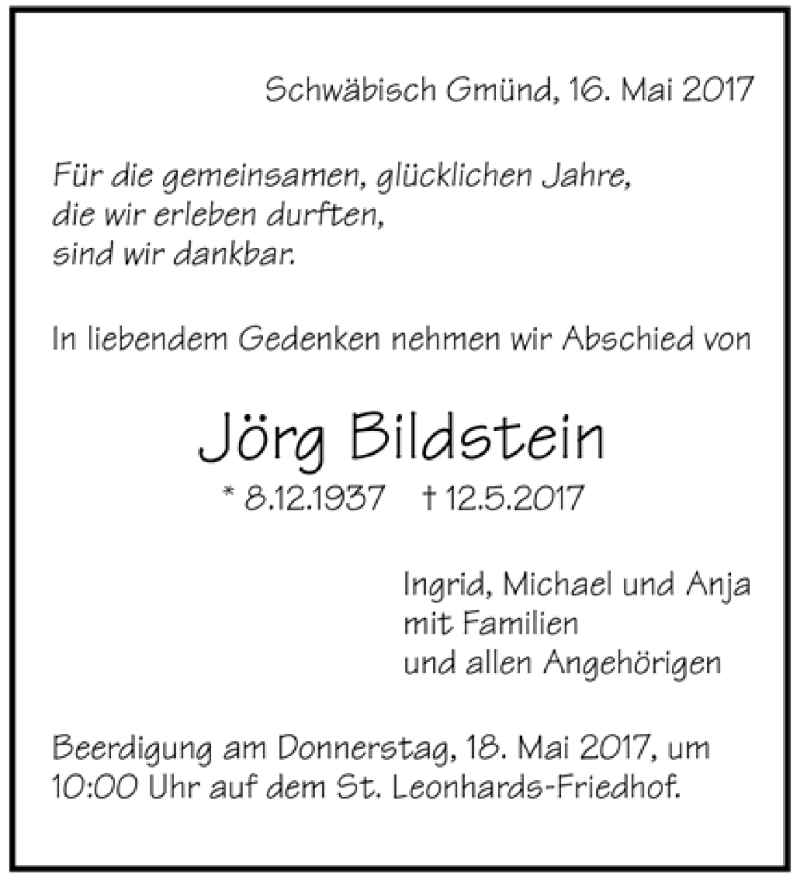Hier finden Sie alle Traueranzeigen aus der Zeitung, die bisher für Jörg Bildstein erschienen sind. Weitere Traueranzeigen, die in der Zeitung erscheinen, werden hier ebenfalls aufgelistet