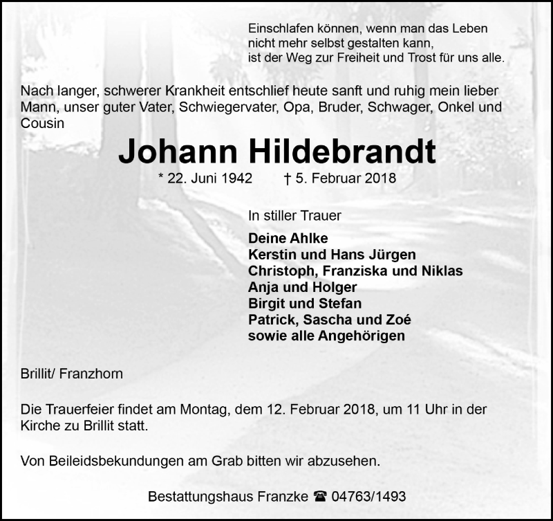 Hier finden Sie alle Traueranzeigen aus der Zeitung, die bisher für Johann Hildebrandt erschienen sind. Weitere Traueranzeigen, die in der Zeitung erscheinen, werden hier ebenfalls aufgelistet