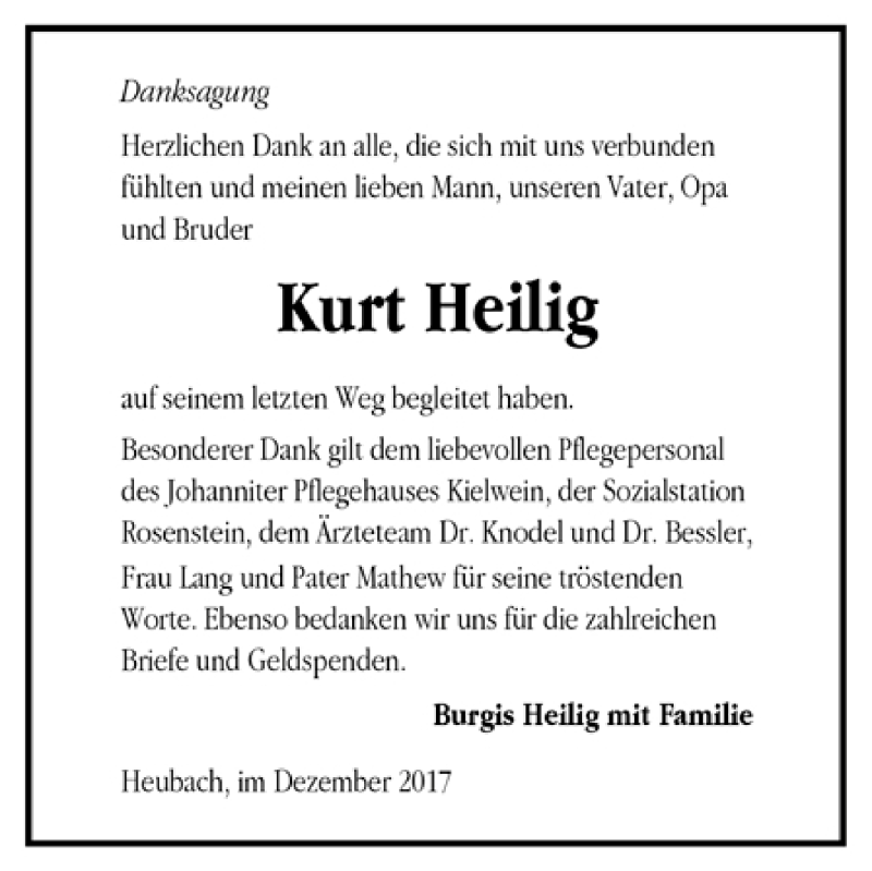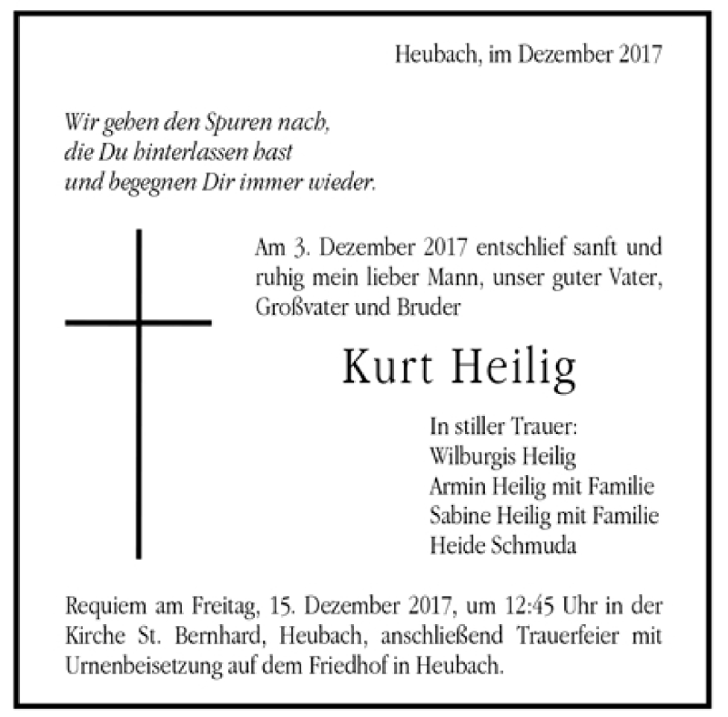 Hier finden Sie alle Traueranzeigen aus der Zeitung, die bisher für Kurt Heilig erschienen sind. Weitere Traueranzeigen, die in der Zeitung erscheinen, werden hier ebenfalls aufgelistet
