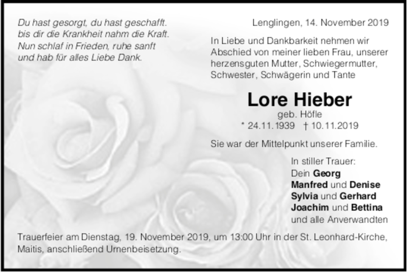 Hier finden Sie alle Traueranzeigen aus der Zeitung, die bisher für Lore Hieber erschienen sind. Weitere Traueranzeigen, die in der Zeitung erscheinen, werden hier ebenfalls aufgelistet