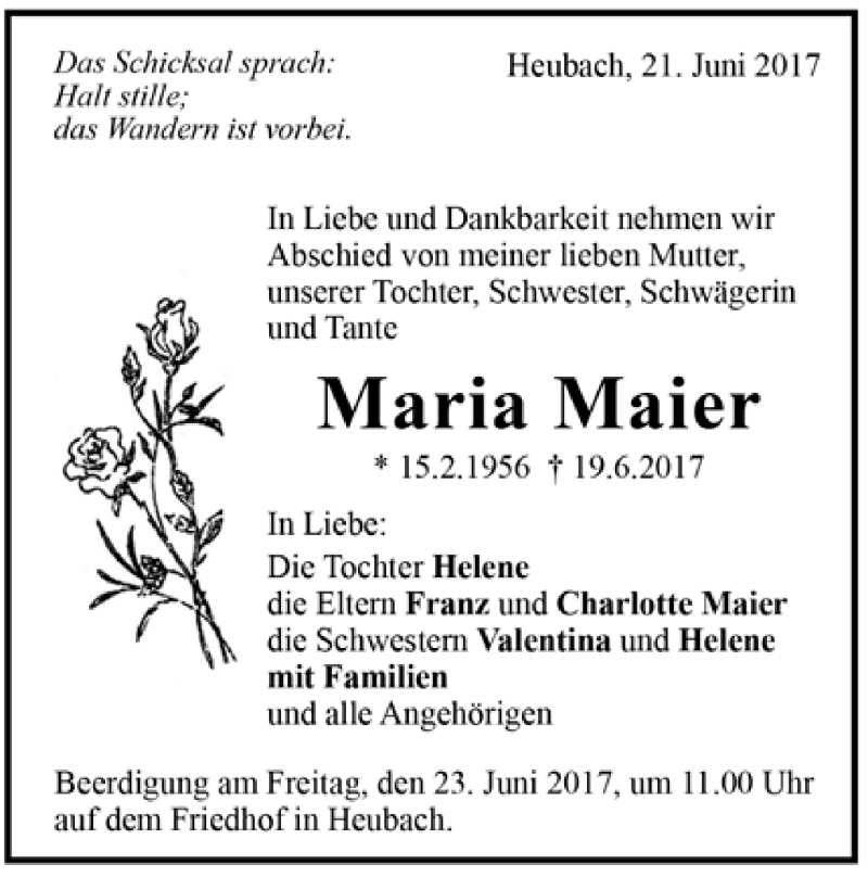 Hier finden Sie alle Traueranzeigen aus der Zeitung, die bisher für Maria Maier erschienen sind. Weitere Traueranzeigen, die in der Zeitung erscheinen, werden hier ebenfalls aufgelistet