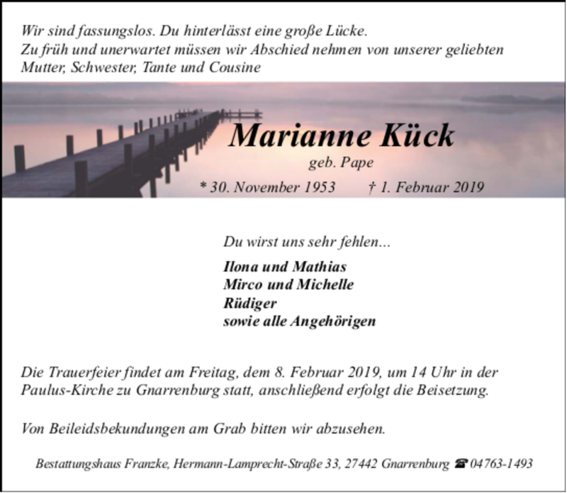 Hier finden Sie alle Traueranzeigen aus der Zeitung, die bisher für Marianne Kück erschienen sind. Weitere Traueranzeigen, die in der Zeitung erscheinen, werden hier ebenfalls aufgelistet