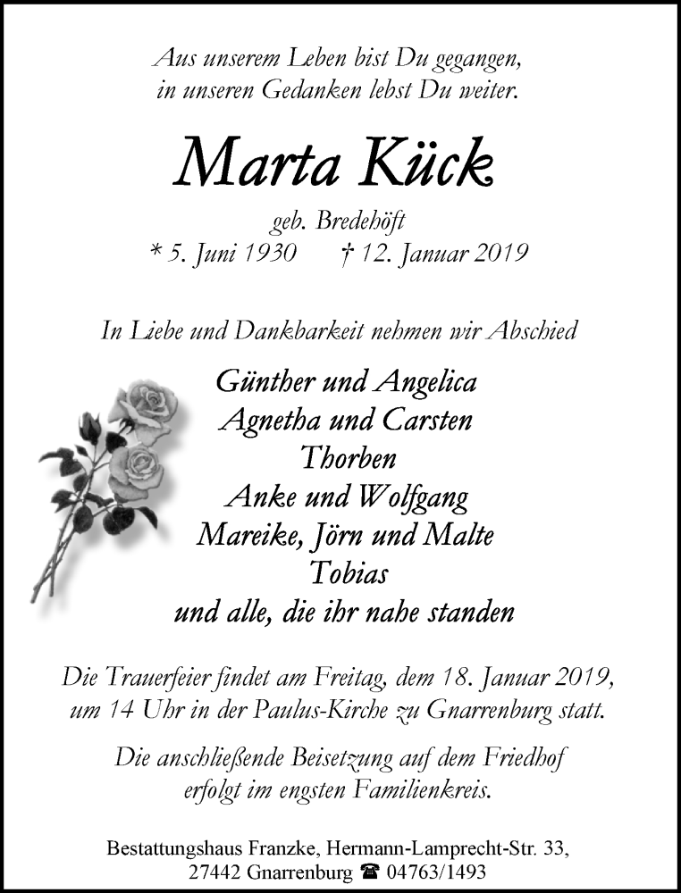 Hier finden Sie alle Traueranzeigen aus der Zeitung, die bisher für Marta Kück erschienen sind. Weitere Traueranzeigen, die in der Zeitung erscheinen, werden hier ebenfalls aufgelistet