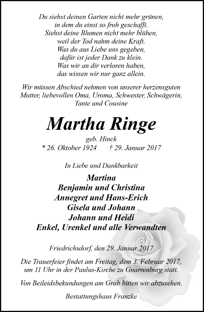 Hier finden Sie alle Traueranzeigen aus der Zeitung, die bisher für Martha Ringe erschienen sind. Weitere Traueranzeigen, die in der Zeitung erscheinen, werden hier ebenfalls aufgelistet