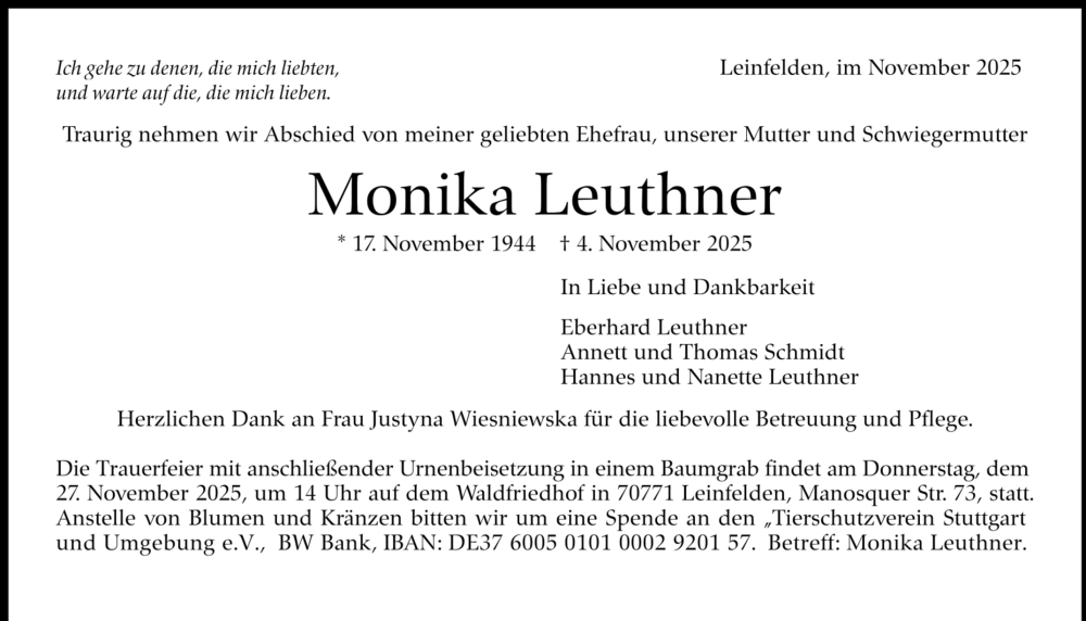 Hier finden Sie alle Traueranzeigen aus der Zeitung, die bisher für Monika Leuthner erschienen sind. Weitere Traueranzeigen, die in der Zeitung erscheinen, werden hier ebenfalls aufgelistet
