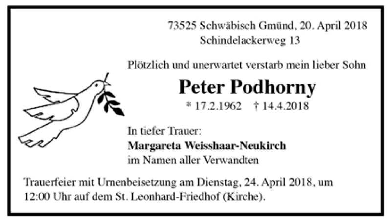 Hier finden Sie alle Traueranzeigen aus der Zeitung, die bisher für Peter Podhorny erschienen sind. Weitere Traueranzeigen, die in der Zeitung erscheinen, werden hier ebenfalls aufgelistet